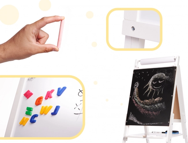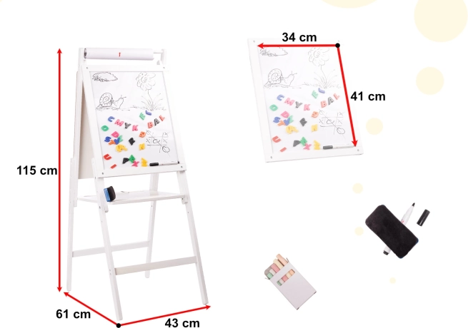 Предлагаме ви страхотна играчка, която комбинира забавление с учене. Двустранната дъска помага за развиване на умения в писане, смятане и разпознаване на букви. Благодарение на своята здрава дървена конструкция дъската е стабилна и лесна за използване за всяка дейност.