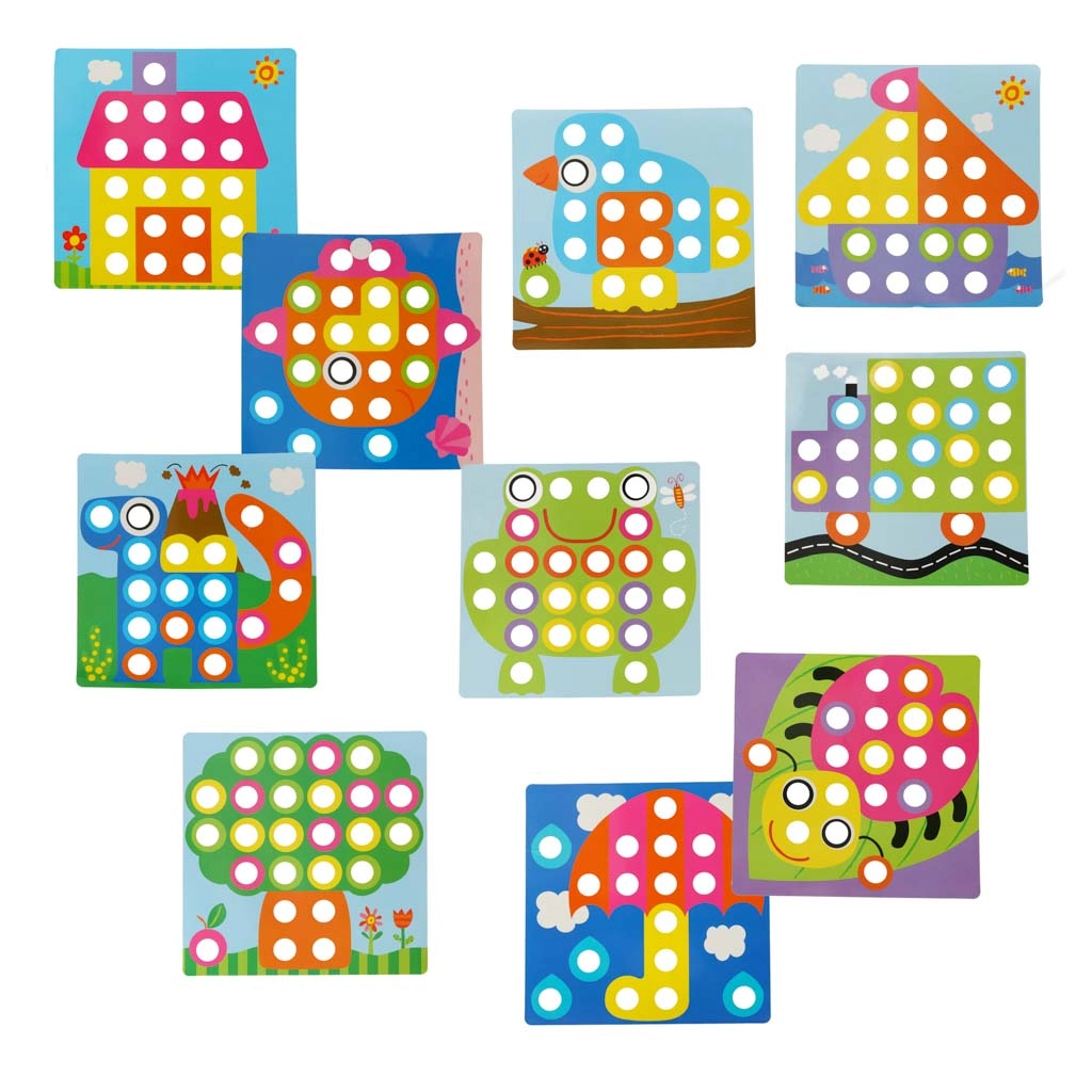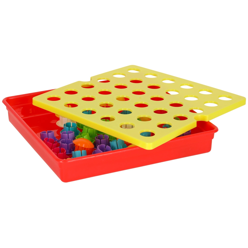 Комплектът включва 10 цветни шаблона с весели мотиви, които подкрепят креативността и ученето на цветове, форми и броене. Стабилната основа едновременно служи като кутия за съхранение, така че частите лесно се държат заедно.