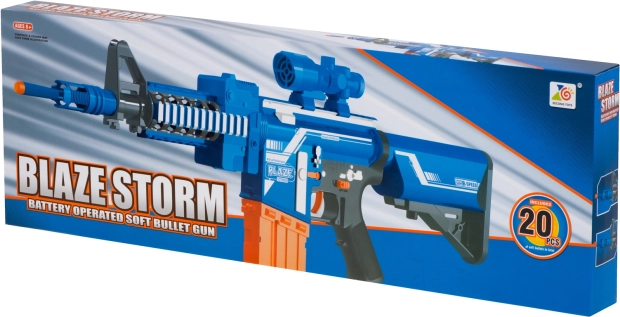 Мощният детски бластер BLAZE STORM носи динамично забавление у дома и навън. Автоматична стрелба на батерии, пълнител за 12 стрели, обхват до 10 м и 20 дунапрени стрели в комплекта. Лека конструкция, сваляем прицел и ергономичен захват подпомагат координацията и моторните умения.