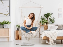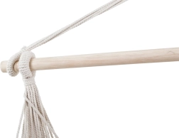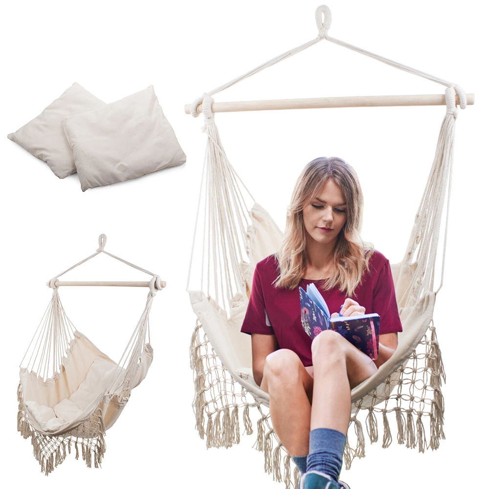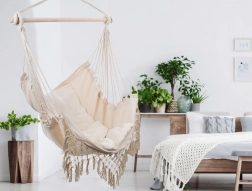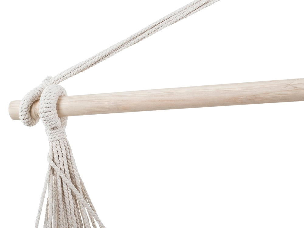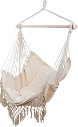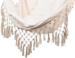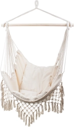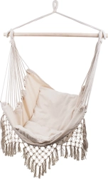 Макраме кантът и декоративните пискюли подчертават бохо визията, която отлично се съчетава с растения и естествени аксесоари. Благодарение на едноточковото окачване столът лесно се монтира на таванна кука или стойка. В комплекта са включени 2 меки възглавници за още по-голям комфорт при четене и релаксация.