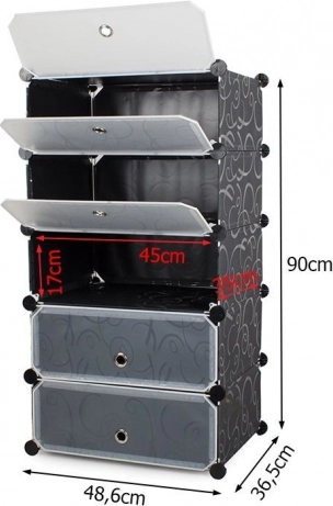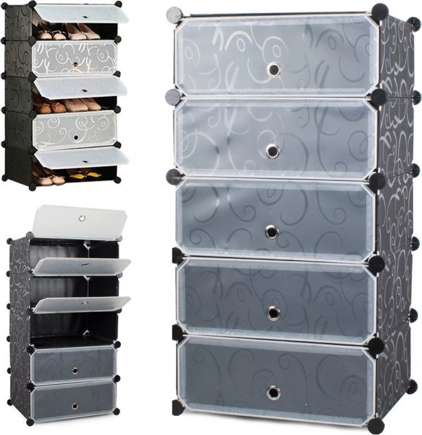 Шкафът за обувки разполага с 5 рафта, които могат гъвкаво да се подреждат един върху друг или един до друг според пространството и нуждите. Конструкцията е лека и стабилна, което улеснява пренасянето и монтажа. Благодарение на прозрачните прозорчета лесно и бързо ще намерите това, което търсите. Материалът на шкафа е водоустойчив и може без проблем да се почиства.