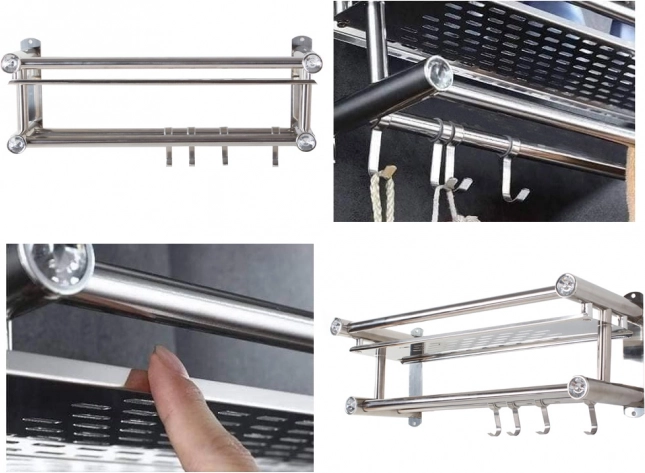 Горната поставка за козметика, двойната пръчка за кърпи и четирите куки поддържат банята ви перфектно организирана.