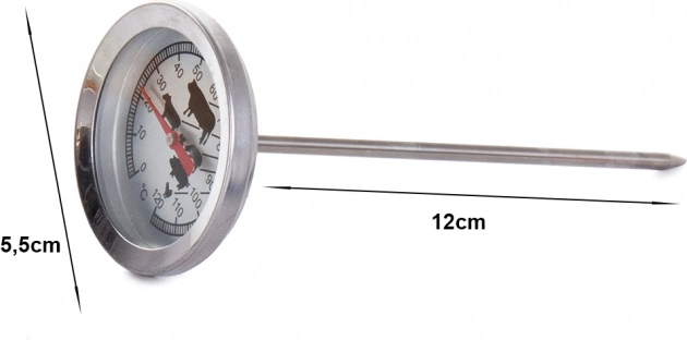 Индикаторният циферблат е оборудван с графики на животни, което улеснява отчитането на оптималната температура за различни видове месо. Удобно измерва температурата от 0 до 120 градуса по Целзий.