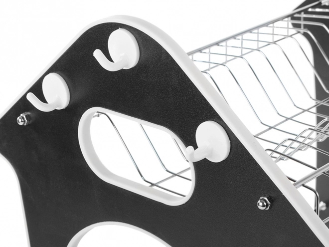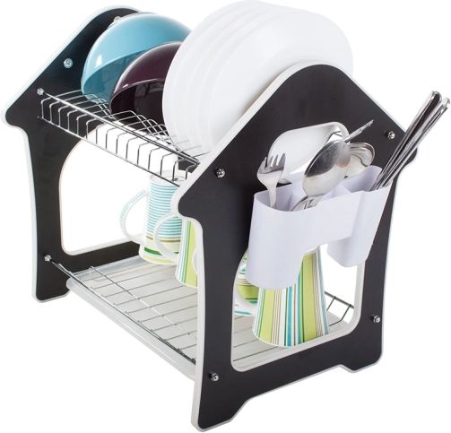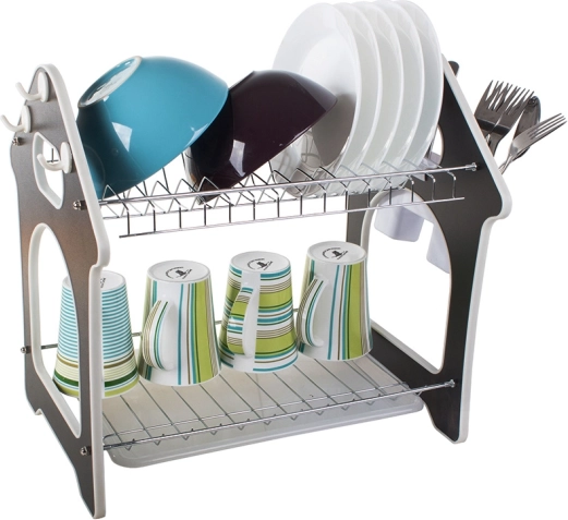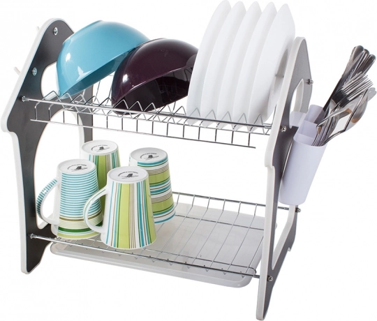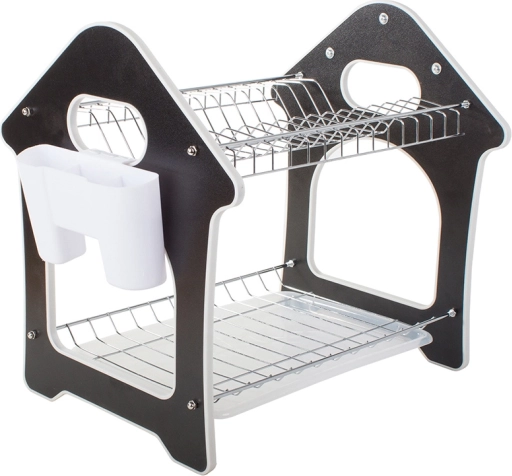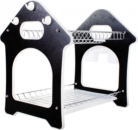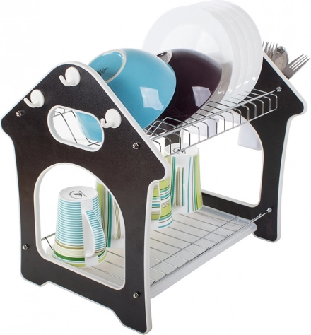 Практичен двуетажен сушилник за съдове с тава за оттичане на водата, държач за прибори и три куки за кухненски аксесоари. Предлага голям капацитет, здрава конструкция от метал и пластмаса и стабилна основа, която защитава плота от влага. Стилният дизайн във форма на къщичка отлично пасва на всяка кухня.