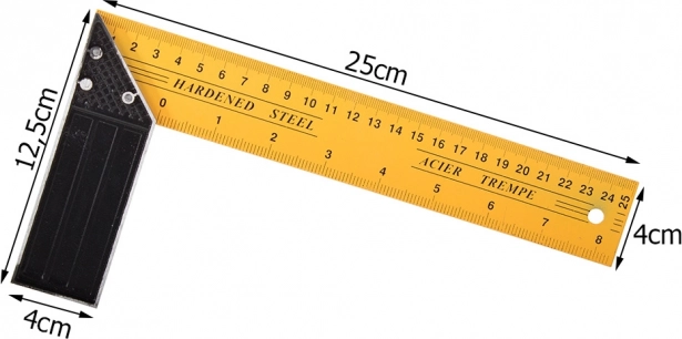 Стоманеният ъгломер е незаменим инструмент за строителни, ремонтни и дърводелски работи. Измерва прецизни прави ъгли и предлага измерване в сантиметри и инчове благодарение на скалите от двете страни.