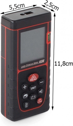 Дигиталният лазерен далекомер е проектиран за точно измерване на разстояния с помощта на лазерна технология. Максималният му обсег е 40 метра, което го прави идеален помощник за измерване на големи пространства като сгради, градини или складове. Уредът се управлява лесно и благодарение на компактните размери може удобно да се носи в джоб или калъф.