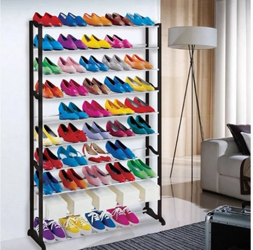 Конструкцията комбинира пластмасови колони и алуминиеви тръби за ниско тегло, стабилност и бърз монтаж. Регулируемият брой нива 1–10 и разстоянието между рафтовете 14 см ви позволяват да нагодите стойката за маратонки, обувки на ток и детски обувки.