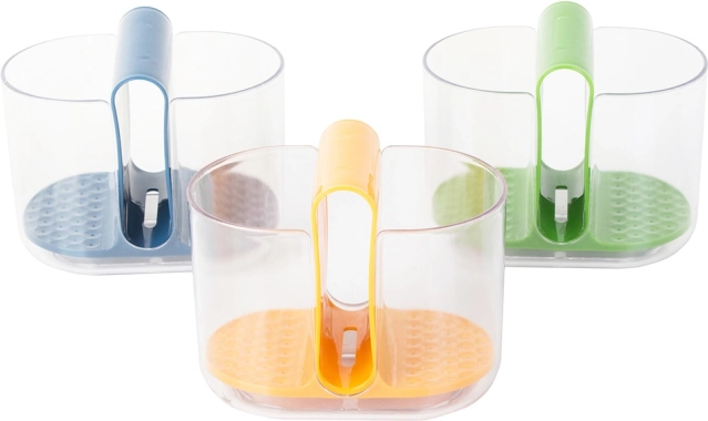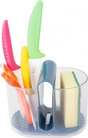 Страничните отделения са предназначени за прибори, докато средното отделение е идеално за гъба за миене. Интегрираните отвори позволяват водата от приборите да се оттича към дъното, което осигурява бързо изсъхване. Този отцедник се сваля лесно, което улеснява изпразването и поддръжката.