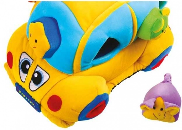 Открийте забавния текстилен автомобил с приятелско личице, проектиран като безопасна играчка с вмъкваеми елементи за малки деца. Мекото плюшено тяло е приятно на допир, а отделните форми при манипулиране шушукат, писукат или нежно иззвъняват. Един от елементите съдържа огледално фолио, което подтиква децата към откриване и развива визуалното възприятие.