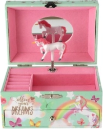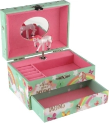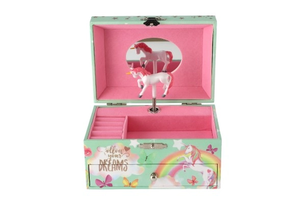 Тази стилна музикална кутия за бижута с еднорог е идеална за съхранение на пръстени, обеци и малки тайни. При отваряне на капака с огледалце и след навиване на ключето бело-розовият еднорог се завърта и зазвучава нежна музика. Вътрешността предлага организирано пространство за бижута, а долното чекмедже побира допълнителни ценности.