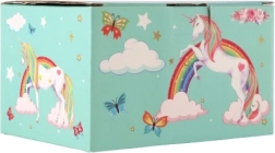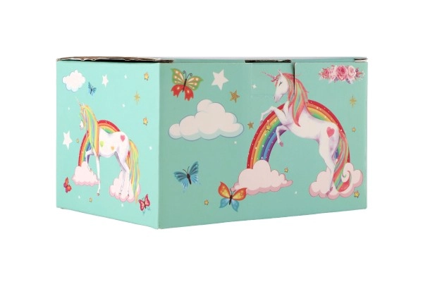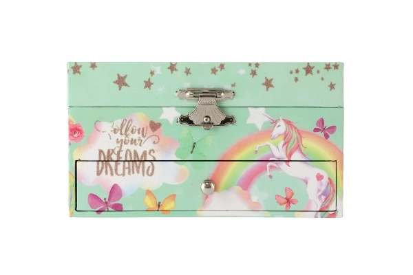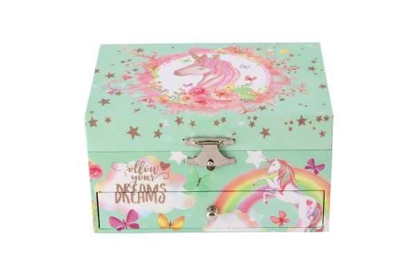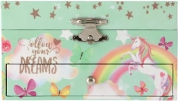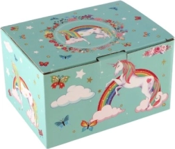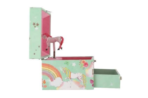 Вълшебна музикална кутия за бижута с мотив на еднорог в пастелно зелено, която ще зарадва всяка малка дама. След навиване на ключето вътре се завърта фигурката на еднорог и зазвучава нежна мелодия. Вътре ще откриете огледалце, практични отделения и удобно чекмедже за дребни съкровища. Здравата картонена конструкция, металните елементи и очарователните илюстрации на дъги, звездички и пеперуди чудесно допълват детската стая.