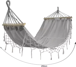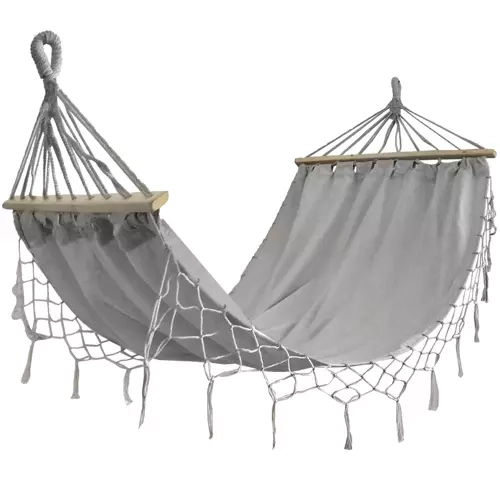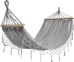 Хамакът GARDLOV съчетава естествена визия с висока издръжливост. Мекият на допир памук с примес на полиестер диша добре и издържа на всекидневна употреба. Дървените разпънки (80 cm) поддържат платното разперено, така че можете удобно да легнете или да поседнете.